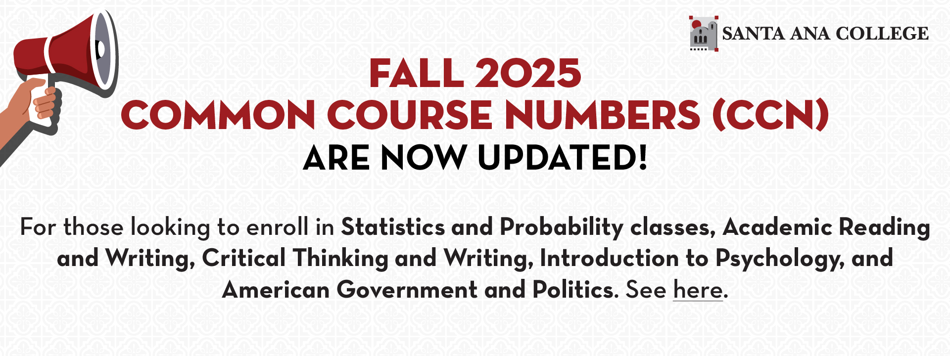 The chart below provides a list of the current and new course prefixes, numbers, and titles based on the CCN system. If you have any questions, please meet with a counselor at Santa Ana College.