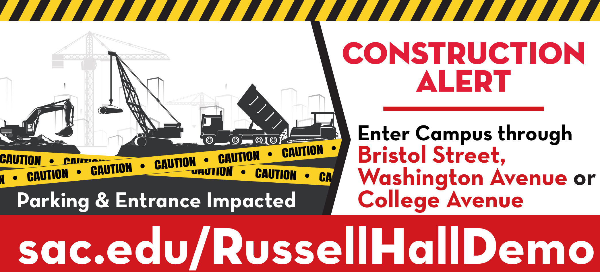 Vehicle access in and out of the SAC campus can only be accessed through Bristol Street, Washington Avenue, and College Avenue, There is no vehicle access to the SAC campus through the Main Entrance at 17th Street by the X Building. Pedestrian access in and out of the main entrance from the bus drop off adjacent to X Building will still remain open during construction. See the attached map.