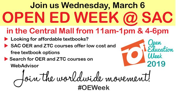 Faculty can participate by wearing our "SAC Uses OER/ZTC" T-shirts on Wednesday, March 6th, and any day you teach your OER course(s)! Have a conversation with your students about OER and why you chose to use for your class!