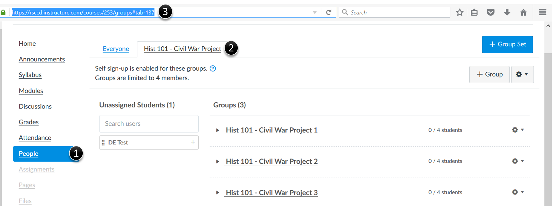 If students will be self-enrolling in a group, instructors will need to provide a URL to the Groups tab in People on their instruction page for the group. To get the Groups Tab URL, click the People (1) link on the Course Navigation Menu, then click the tab of the self-enrolled group (2). Highlight the entire URL (3) in the address bar, then paste the link into the instruction page. This will provide students with to access the Group page to self-enroll.