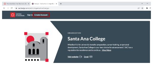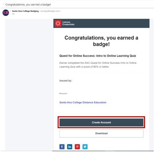 When a badge is awarded, you will receive an Email from Santa Ana College Badging (NoReply@Badgr.com). Open the Email and click on the Create Account button located at the bottom of the Email.
