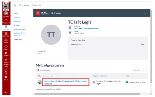 The Parchment Digital Badges Home Page will show all course badges, and the status of the badge (not earned, in progress, or earned). To access the badge, click the badge name located towards the bottom of the page under My Badge Progress.