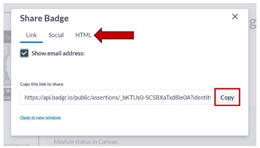 Use the tabs at the top to select if you will share by URL, Social Media, or HTML. You have the option of displaying your Email address on the badge when it is shared. To display your Email address, ensure that the check box next to Show Email Address is selected. To hide your Email address, click the box to deselect it. To share a badge, click the Copy button located to the right of the unique URL. The URL can then be pasted into a message to share.