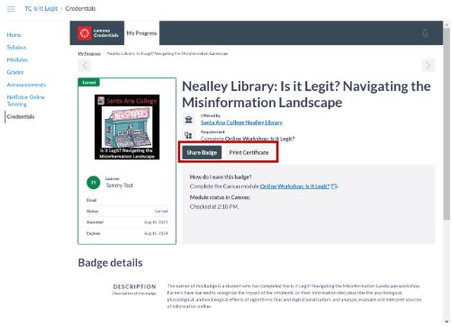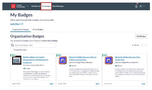 You can easily access, manage, share and print your badges/certificates outside of Canvas. Just create a Parchment Digital Badges Account. Earners will retain access to their badges/certificates forever through the Santa Ana College Parchment Digital Badges website.