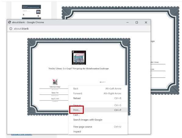 A print box will appear with the preview. If there is no option to print, right click on the preview and select Print from the menu. The certficate can be printed on paper, or saved as a PDF.