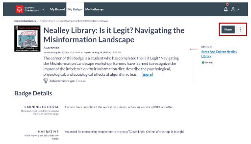 To access a badge, click on the badge name. The badge can be shared or the certificate printed from the page. To share the badge, click the Shared button located in the upper right of the page. To download the certificate, click the three dot button located in the upper right of the page.