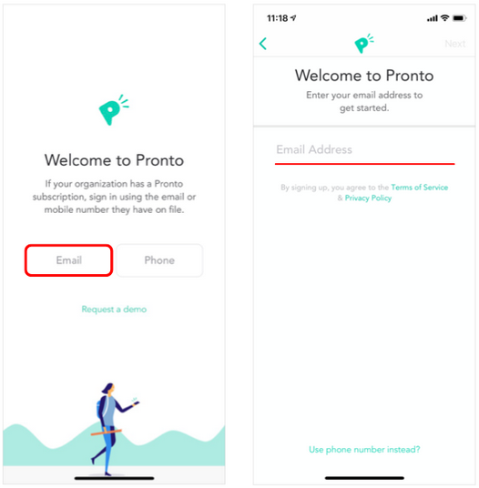 - Once you open Pronto on your mobile phone or tablet, tap on the "Email" button and enter the email address you use to log in to Canvas.