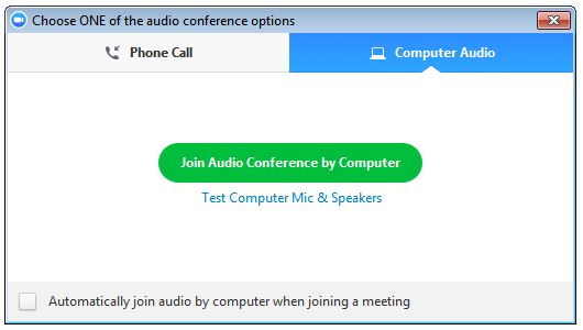 - After you've clicked on "Join," you will receive a prompt with options on how to enter the meeting, click "Phone Call" or "Computer Audio" and select your current camera and microphone if necessary.