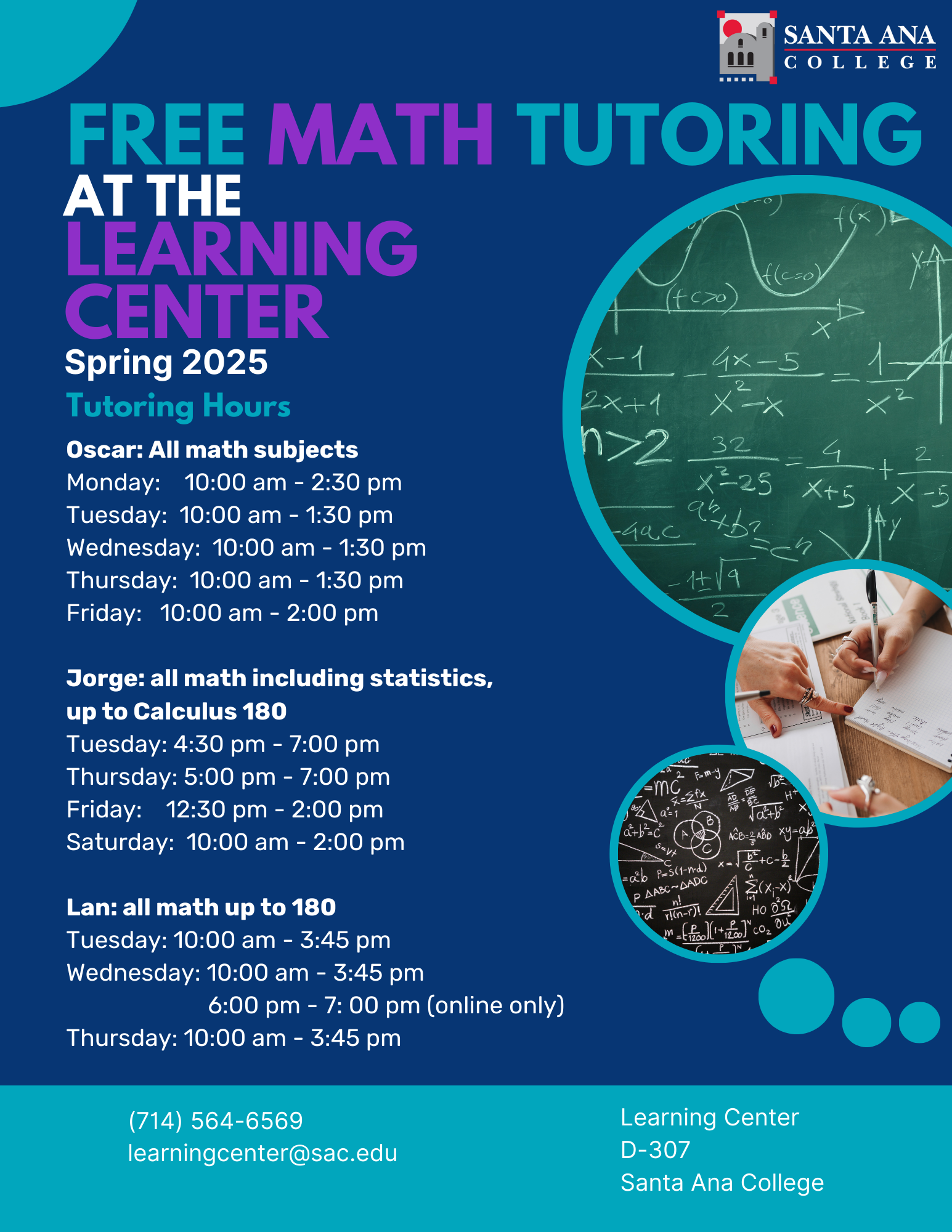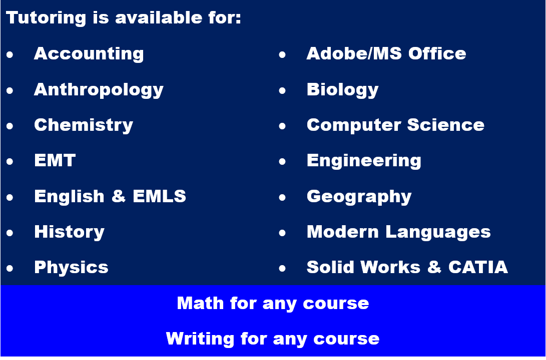 Writing a paper? We have writing tutors to provide direction and feedback on any SAC or CEC assignment as well as on personal statements, resumes, etc. Need explanations about math and science concepts? We have tutors for all math classes, biology, chemistry, physics, engineering