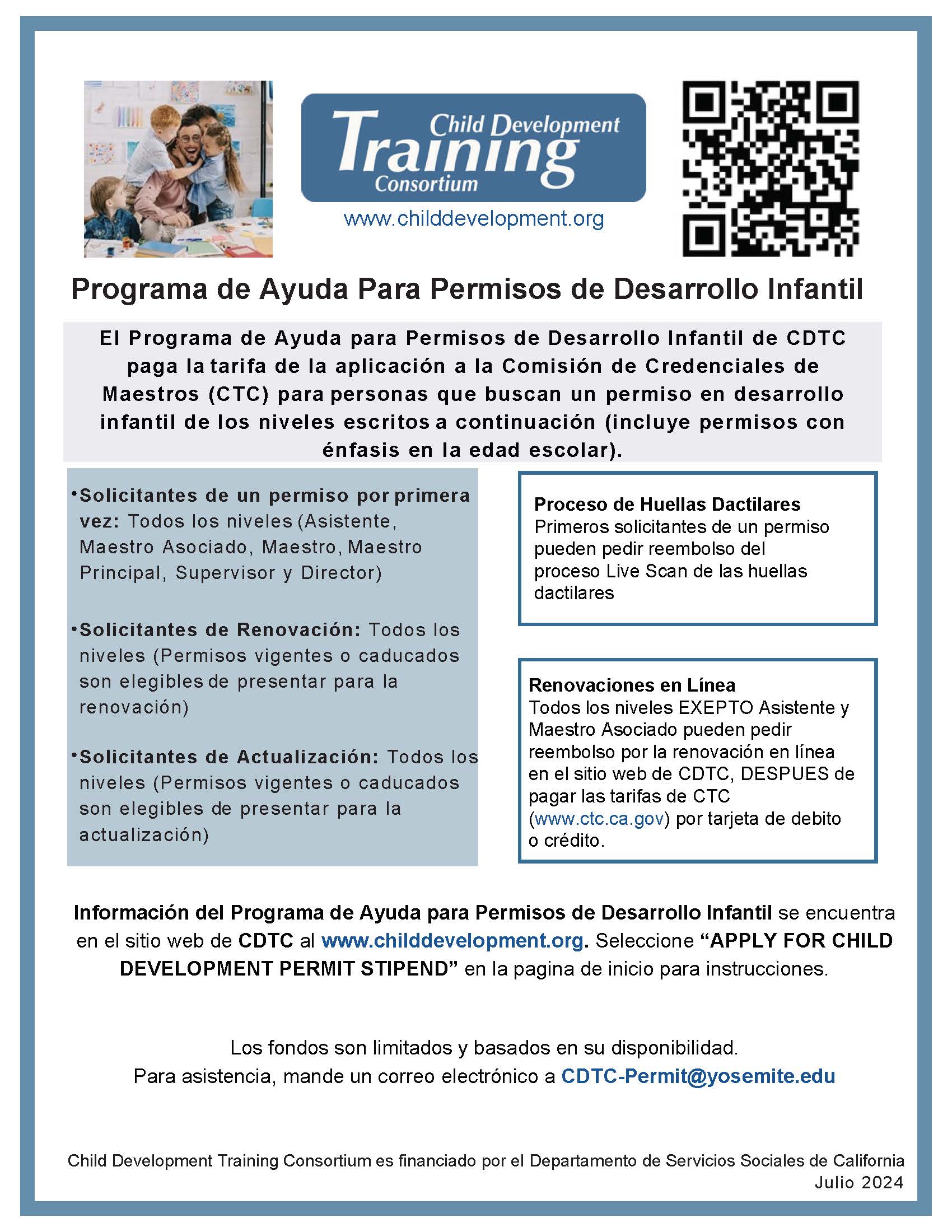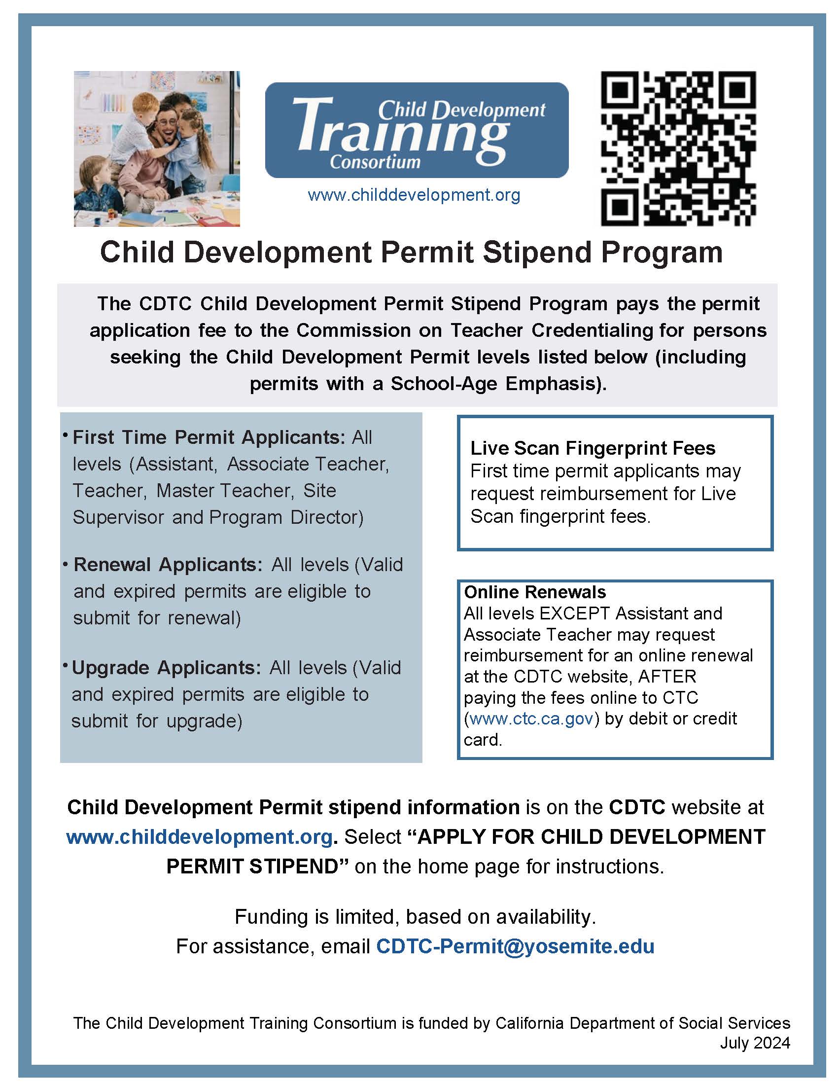 Funding is available for students that will pay for the application fee and reimursement for the live scan fingerprint fees through the child development permit stipend from the child development training consortium.