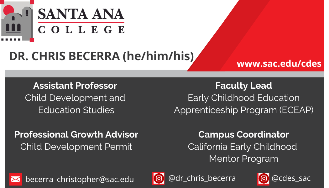 E-mail: becerra_christopher@sac.edu Courses: CDEV 107; CDEV 108; CDEV 111A; CDEV 111B; CDEV 205/EDUC 203, CDEV 221;