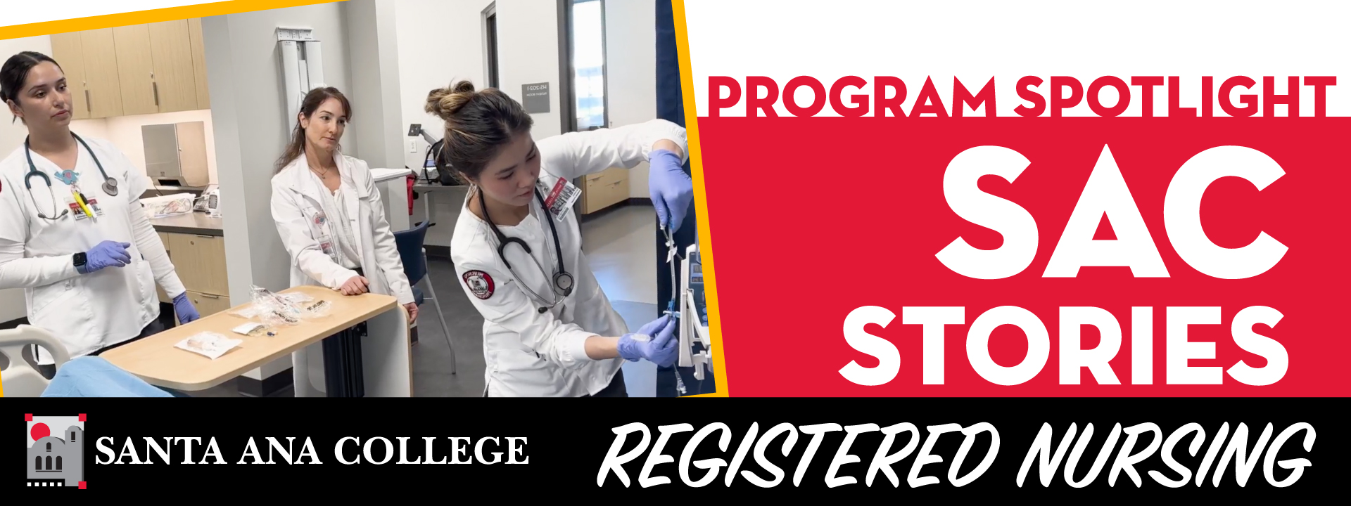 For more information about the Registered Nursing program at Santa Ana College, visit the SAC RN Program Website. The application period for Fall 2024 admission is February 1-15, 2024, while the application period for Spring 2025 admission to the RN program is September 1-15, 2024.. SAC's Nursing department can be reached at (714) 564-6825.