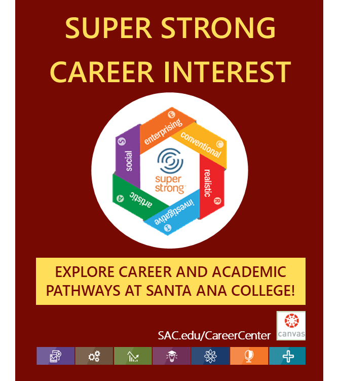 | Use the SuperStrong interest assessment to find your career and academic pathway at SAC! For each pathway, the SuperStrong links your interests to careers, salaries, job outlooks, skills, and the education needed to meet your goals. This is a quick 5-10 minutes to start planning the next steps in your life.