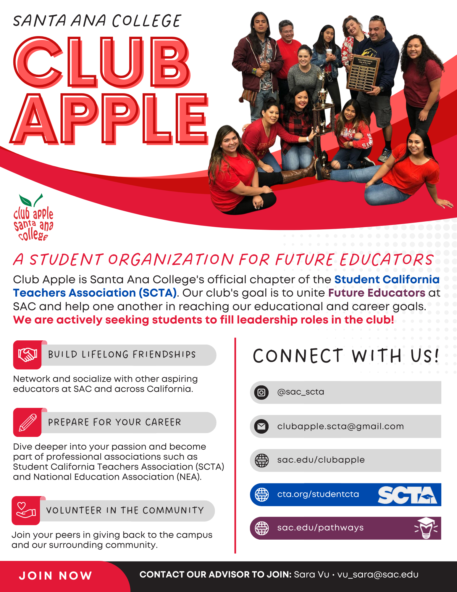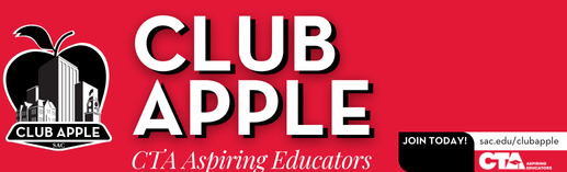 Club Apple is Santa Ana College's official chapter for the Student California Teachers Association - Aspiring Educators (CTA-AE), a statewide organization that provides professional development, networking, and community outreach opportunities to college students who are interested in careers as educators, particularly those pursuing pathways to teaching. CTA-AE serves as the collective voice for these students and as advocates for fairness, justice, and equity. CTA-AE's mission is guided by the core values of teacher quality, community outreach, diversity, and advocacy.