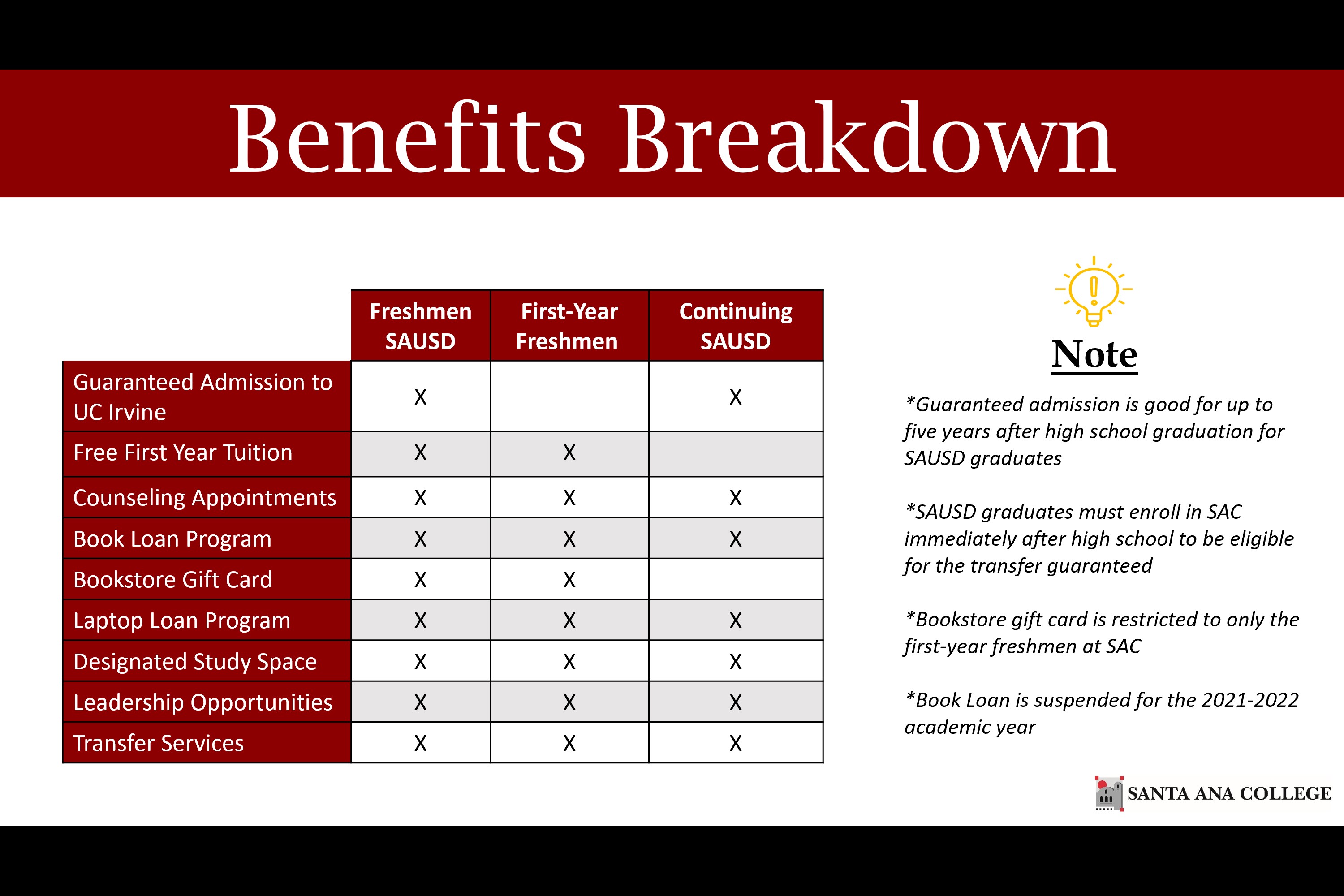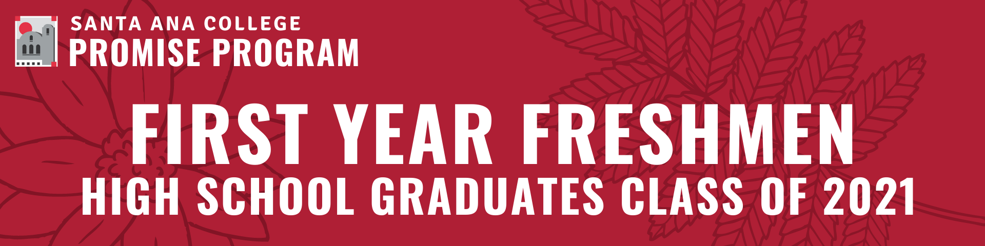 Santa Ana College is committed to your success! The Santa Ana College Promise program serves all First Year Freshmen (High School or equivalent class of 2025) college students with strategic benefits and support designed to help you achieve your goals. Eligible students receive free tuition, textbooks, academic support, and more. See below for more information and sign up for our interest list to join.