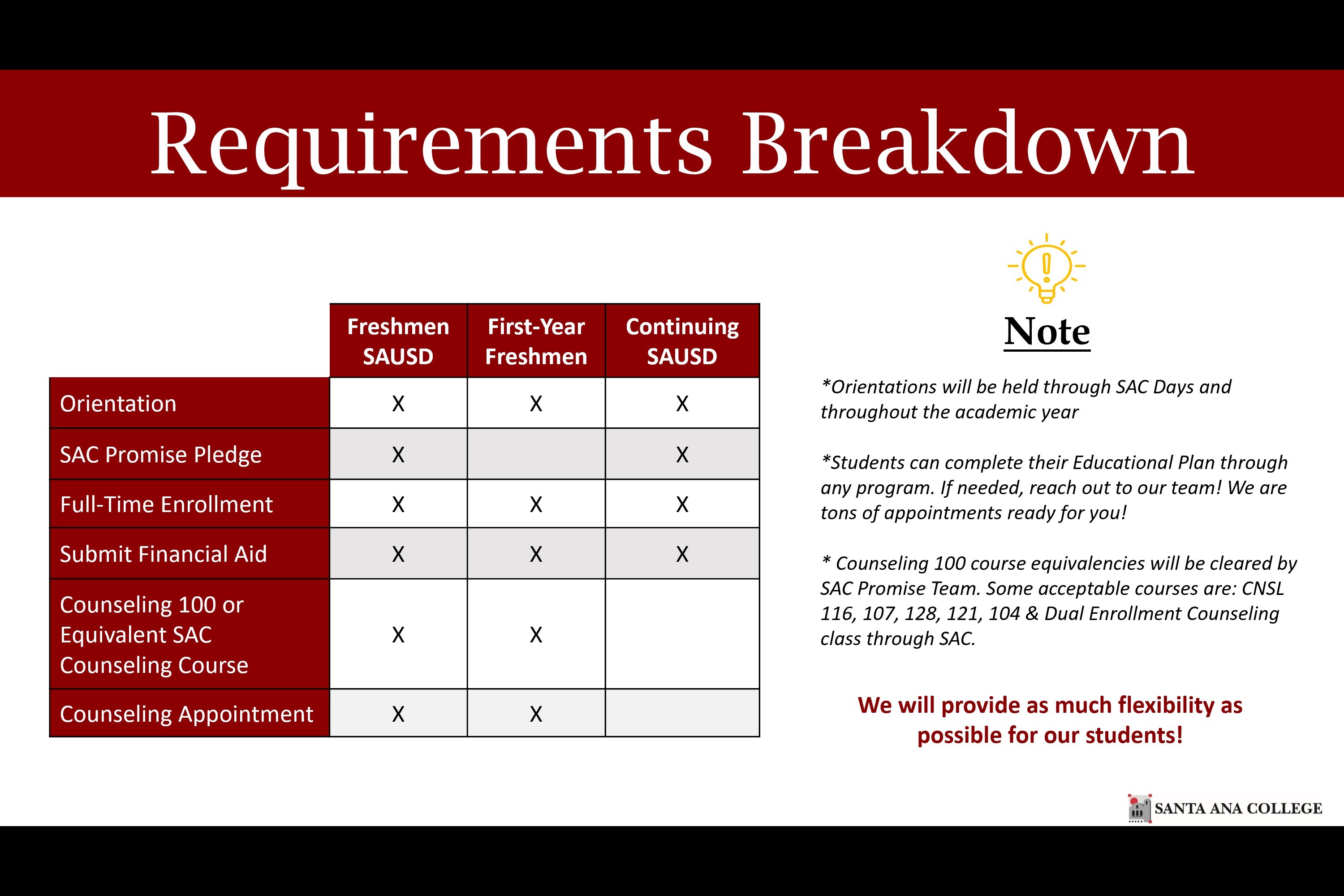 - Students must enroll and complete a Counseling 100 course or equivalent to be eligible for their bookstore gift card. Equivalency will be determine by SAC Promise Program staff during the orientation.