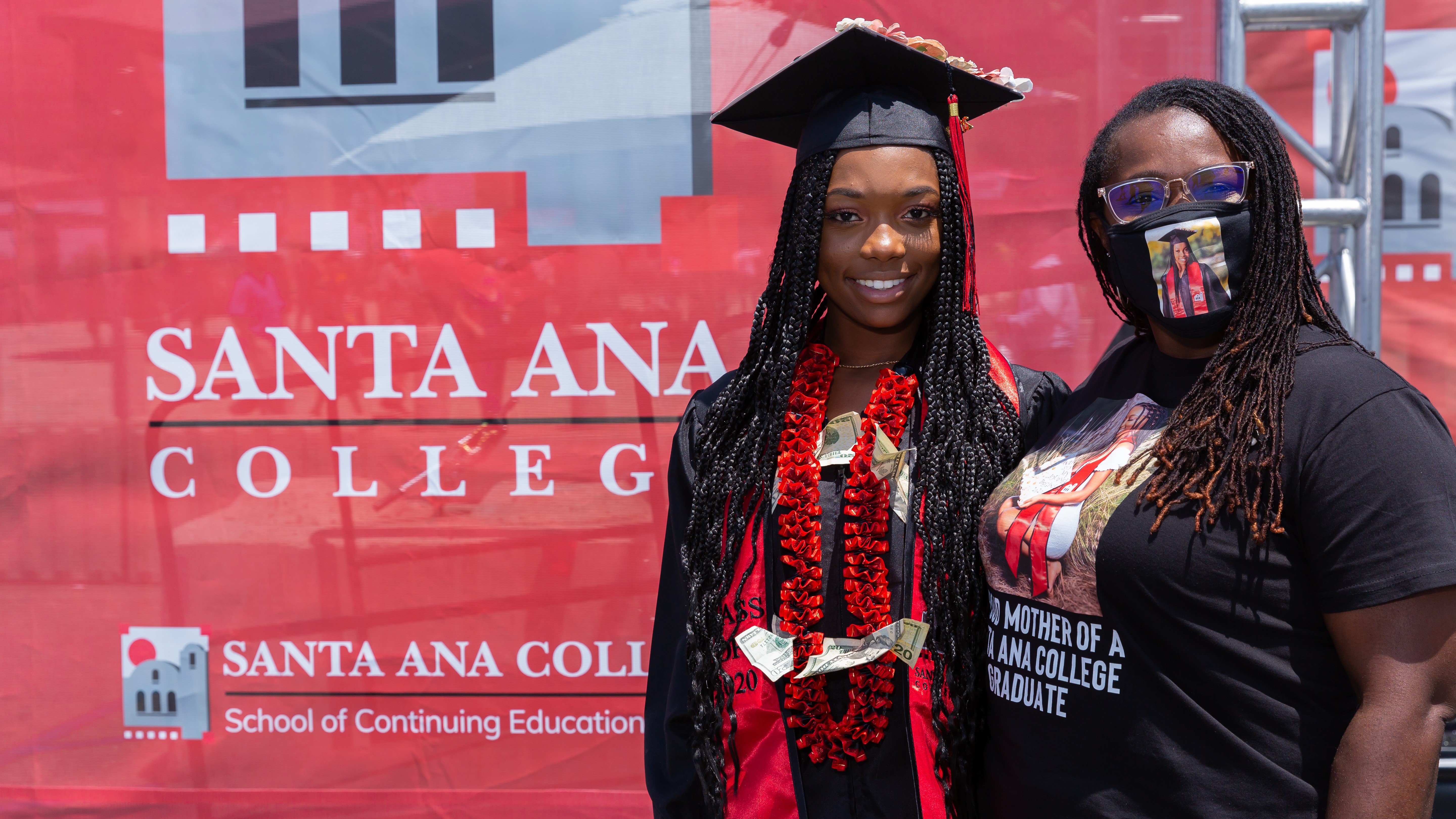Student poses with mother in front of photobooth at 2020-2021 Commencement in Angel Stadium.
