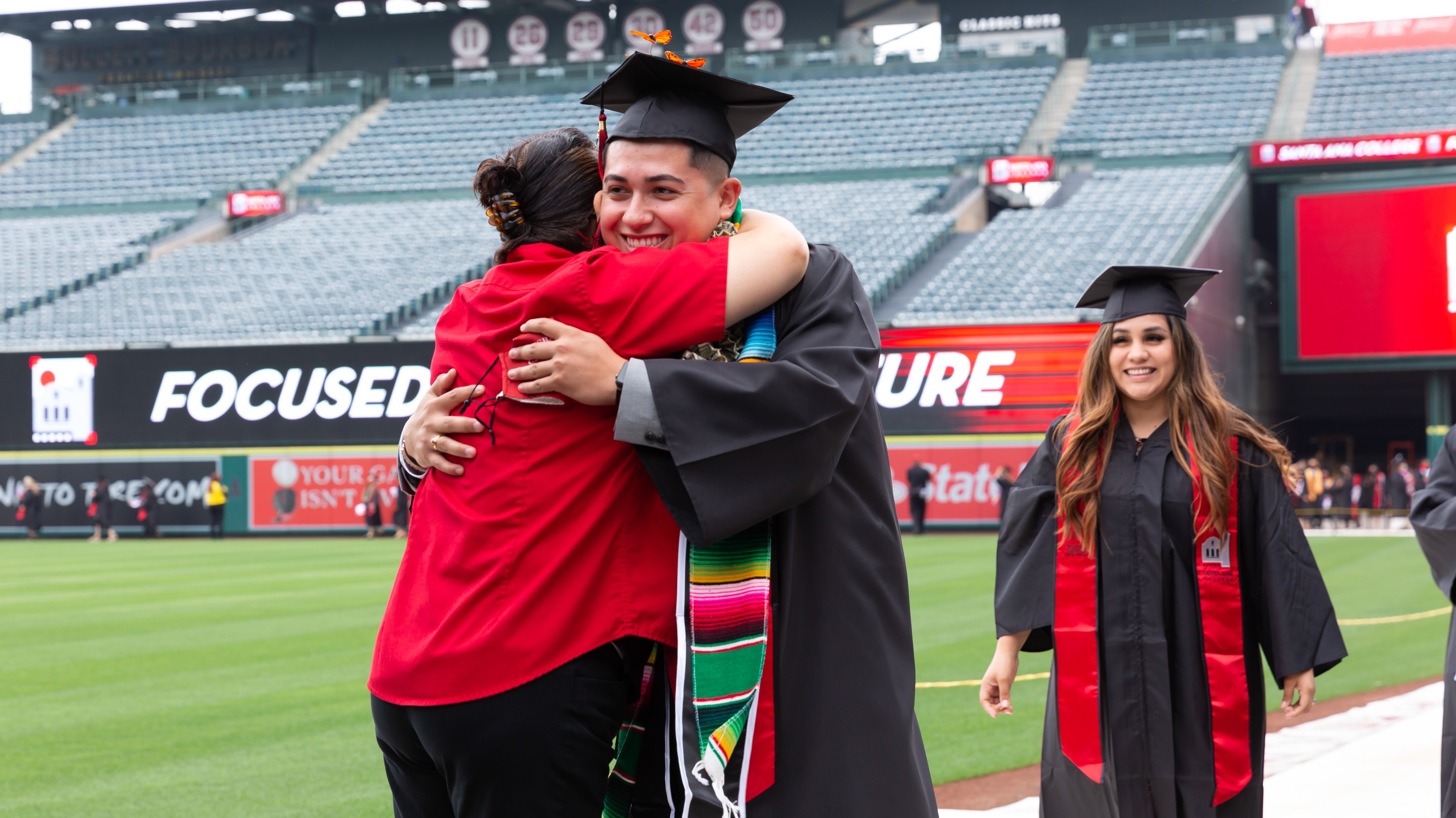 Student hugs advisor at 2020-2021 Commencement ceremony at Angel Stadium.