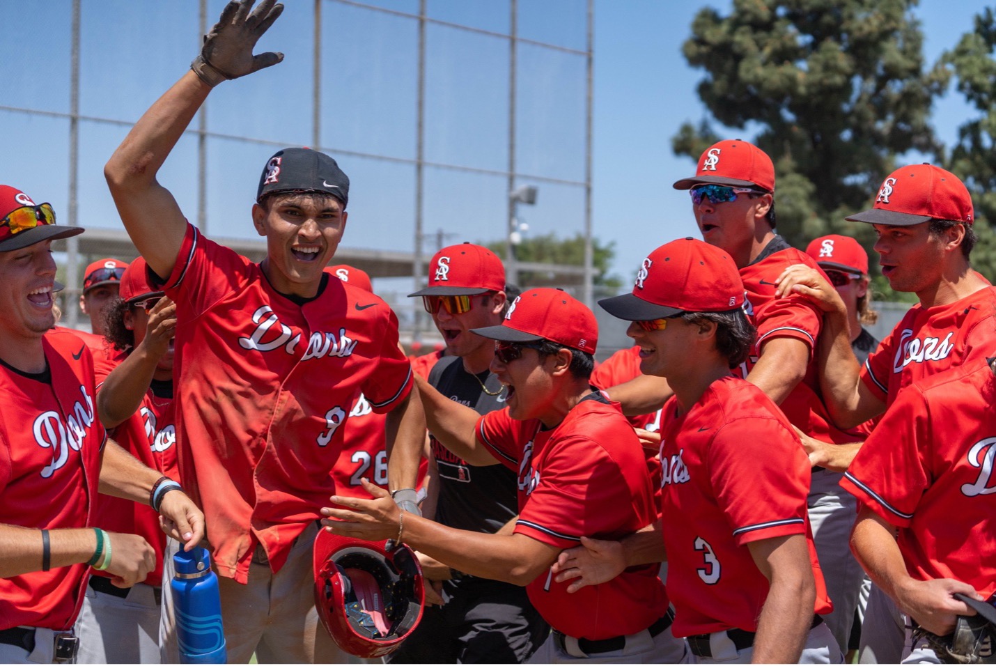 Ryann Stock (ở giữa bên trái) thuộc Đội bóng chày vô địch bang CCCAA 2023 của Đại học Santa Ana ăn mừng với đồng đội sau khi giành chiến thắng.
